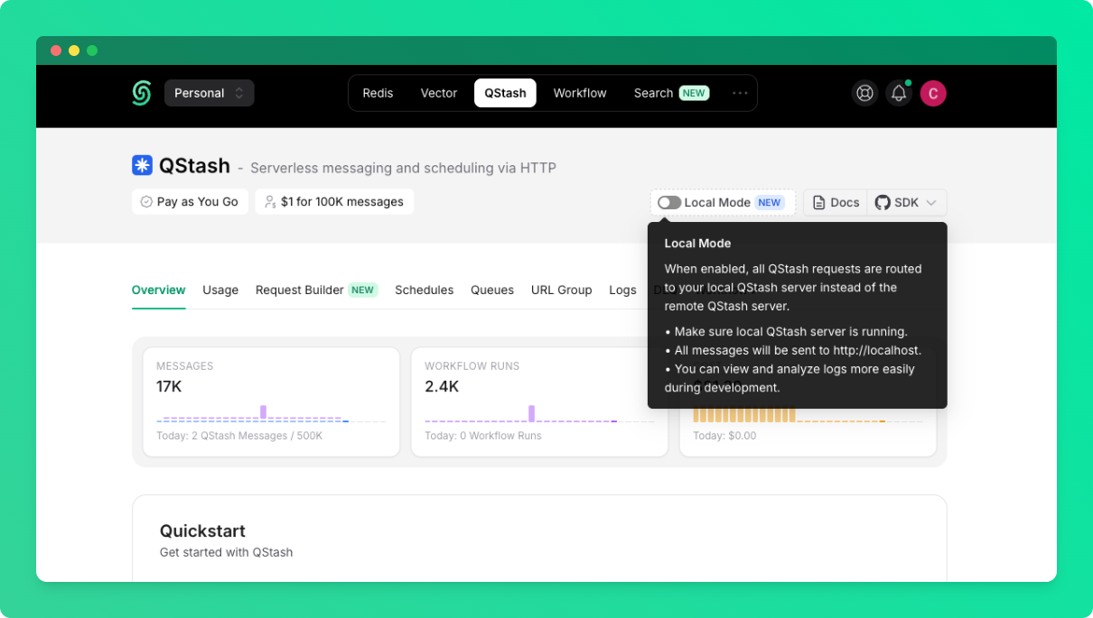 Once you start the local server, you can go to the QStash tab on Upstash Console and enable local mode, which will allow you to publish requests and monitor messages with the local server.