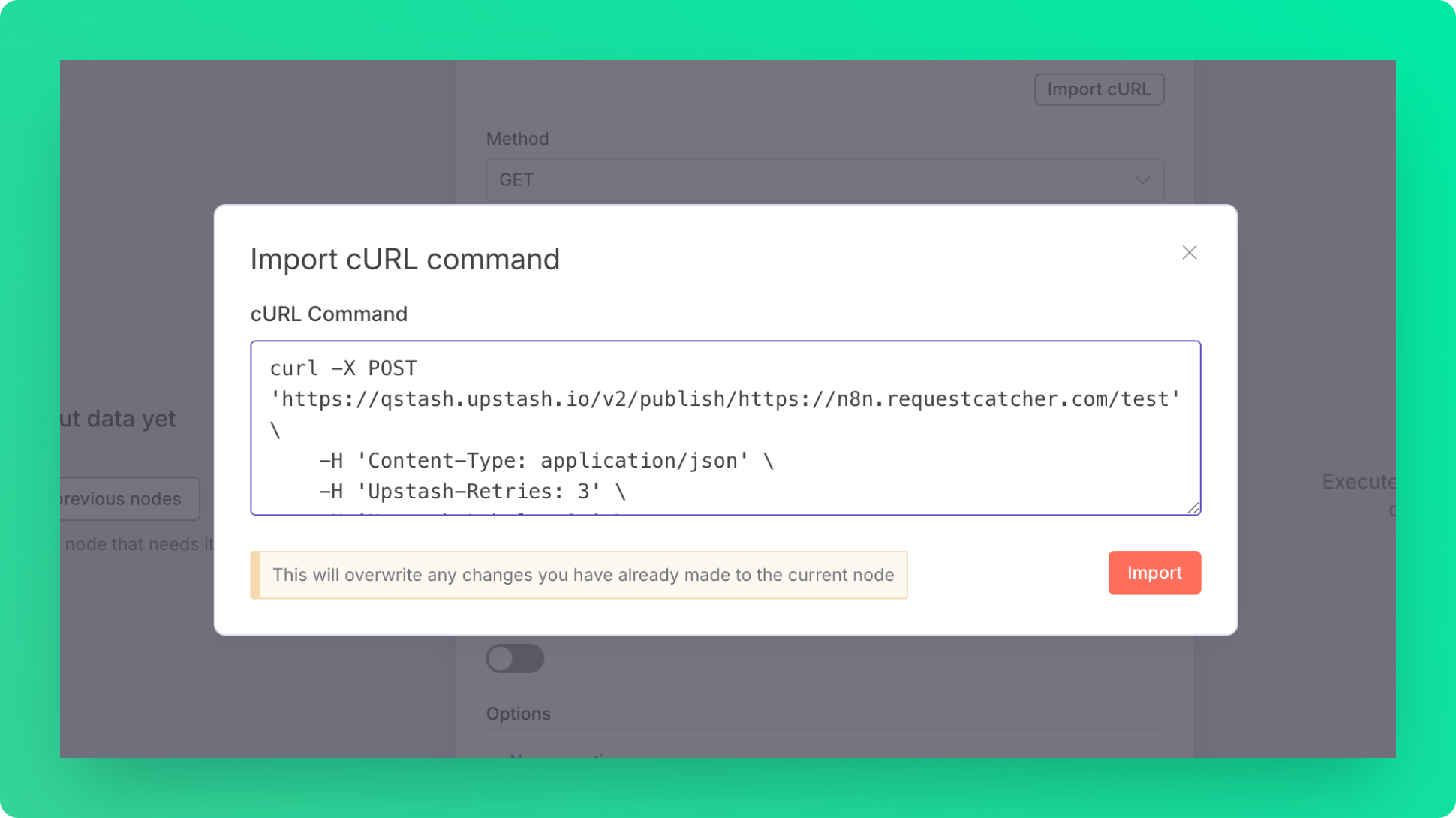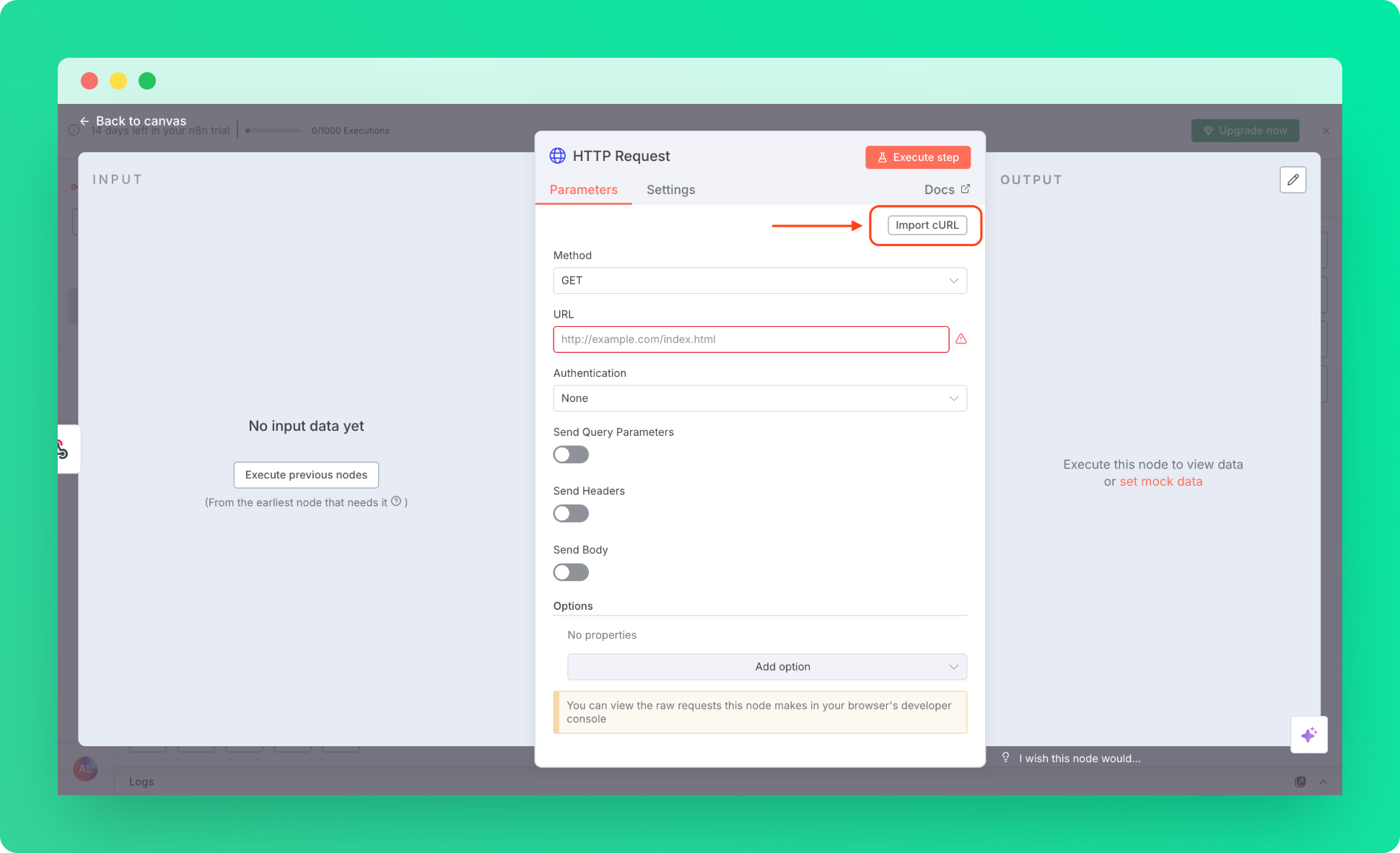 4. Back to the n8n, in HTTP Request Parameters tab, use import cURL.
